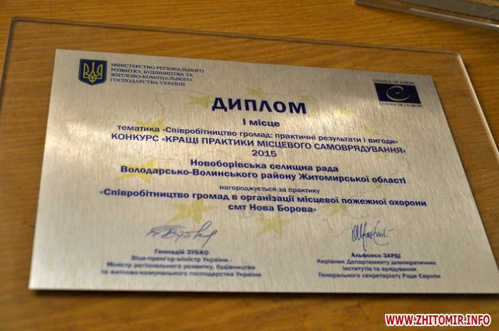 «Три роки тому на добровільних засадах із залученням коштів місцевих бюджетів Хорошівського району було утворено місцеву пожежну охорону. Проект «Співробітництво громад в організації місцевої пожежної охорони смт Нова Борова» у минулому році виборов перше місце за напрямком «Енергозбереження та енергоефективність» у щорічному конкурсі «Кращі практики місцевого самоврядування». У рамках його реалізації повністю оновлено занедбане приміщення пожежної охорони в селищі, придбано сучасне обладнання та автотехніку. Саме з такого досягнення почалося об’єднання населених пунктів у Новоборівську ОТГ. Громада об’єднує 18 населених пунктів та має населення близько 10 тисяч», – йдеться у повідомленні.