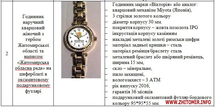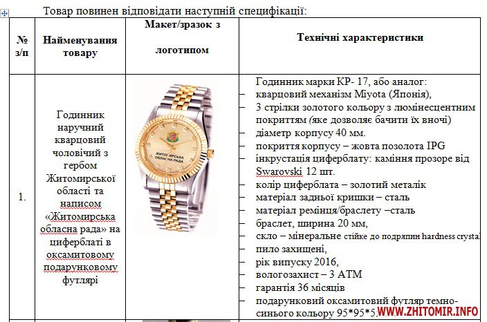 Отже, за 37 980 гривень коштів обласного бюджету протягом 2 тижнів облрада збирається закупити 135 наручних кварцових чоловічих та жіночих годинників з гербом Житомирської області та написом «Житомирська обласна рада» на циферблаті в оксамитовому подарунковому футлярі. Орієнтовна вартість одного годинника складає 281 гривню з ПДВ.
