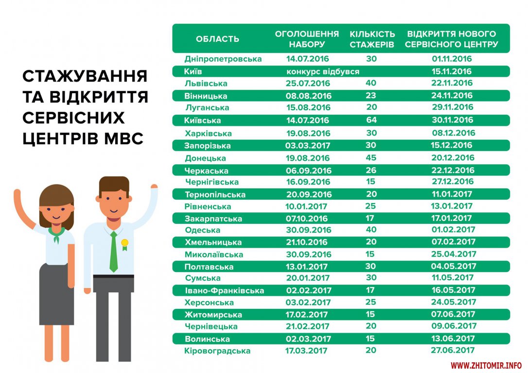 Міністр МВС Арсен Авков на своїй сторінці у фейсбук опублікував попередній графік відкриття оновлених сервісних центрі. Зокрема, у Житомирській області 17 лютого 2017 року буде оголошений набір працівників, планують набрати 15 стажерів. Відкриття нового сервісного центру заплановане на 7 червня наступного року.
