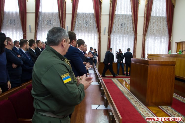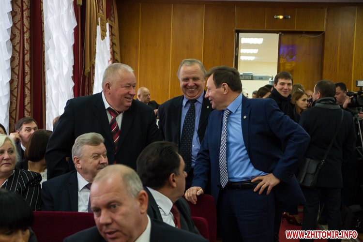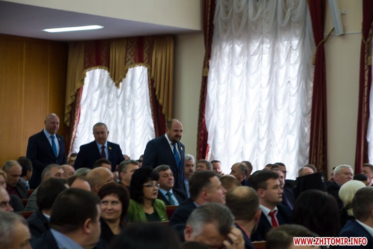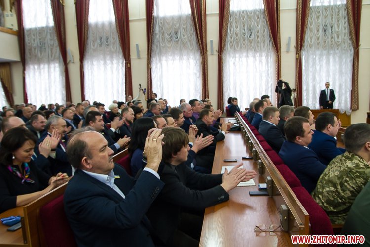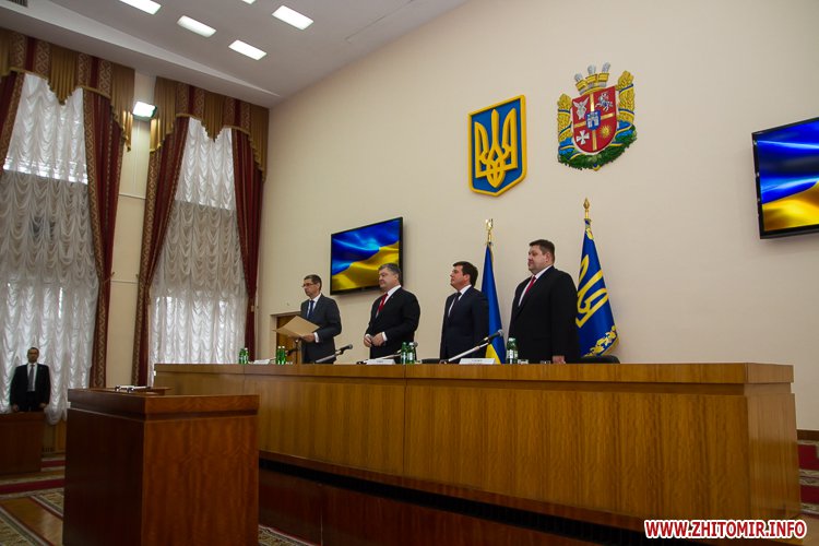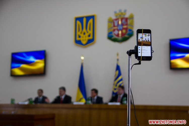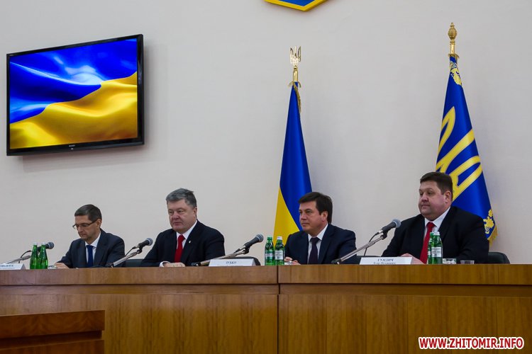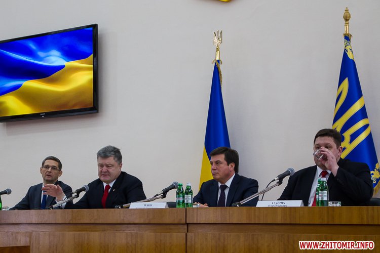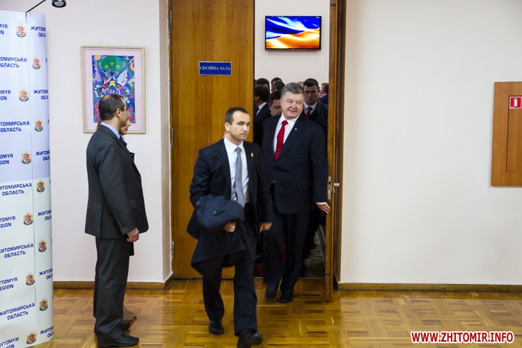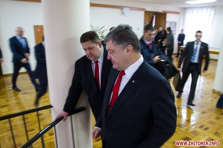 Президента ждали к 12.00, но он приехал с часовым опозданием. В своем выступлении Петр Порошенко говорил о помощи АТОшникам, децентрализации и анонсированном повышении зарплат. Он также хвалил энергичного вице-премьера Геннадия Зубко, который активно занимается децентрализацией, и благодарил бывшего губернатора Сергея Машковского, который в трудное время «подставил плечо». Речь президента, представление нового главы ОГА Игоря Гундича и его слова благодарности заняли в общей сложности 40 минут, после этого Порошенко поехал на житомирский завод «Кромберг энд Шуберт».