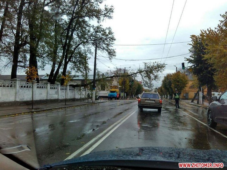 У Житомирі 29 жовтня на вулиці Перемоги, біля російського кладовища, дерево впало на дроти і частково заблокувало рух транспорту.