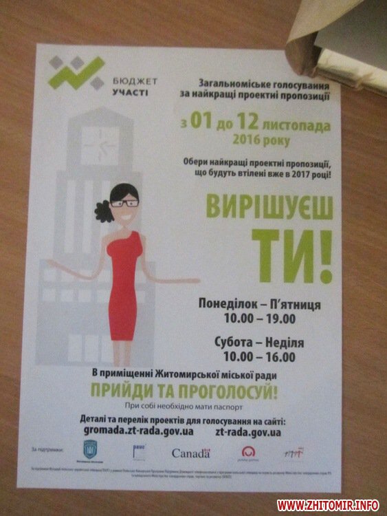Як повідомляв Житомир.info, пункт для голосування працюватиме у приміщенні Житомирської міської ради (перший поверх, фойє) з понеділка по п’ятницю з 10:00 до 19:00 і в суботу з 10:00 до 16:00. Деталі та перелік проектів для голосування на сайті gromada.zt-rada.gov.ua. У голосуванні можуть брати участь особи, які мають реєстрацію місця проживання або перебування в офіційних документах «місто Житомир».