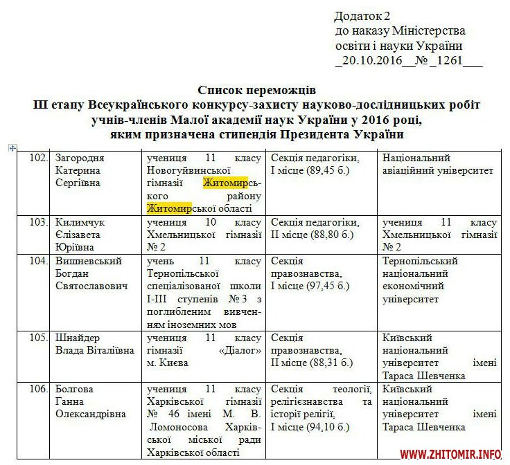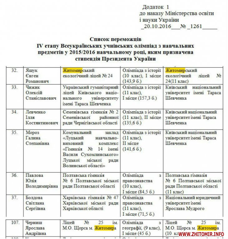 Так, згідно з наказом МОН, стипендію президента призначили учню 11 класу Житомирський екологічний ліцей №24 Євгену Ящуку, котрий переміг у ІV етапі всеукраїнських учнівських олімпіади з історії, та десятикласниці ліцею №25 ім. М. О. Щорса міста Житомира Ярославі Черниш, яка посіла перше місце в усеукраїнській олімпіаді з географії.