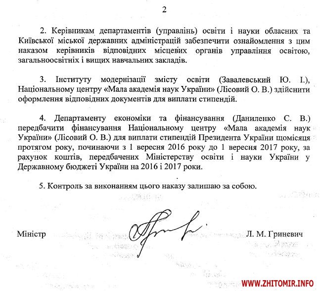 Про це йдеться в наказі Міністерства освіти і науки України від 20.10.2016 №1261 «Про призначення стипендій Президента України переможцям Всеукраїнських учнівських олімпіад з навчальних предметів і Всеукраїнського конкурсу-захисту науково-дослідницьких робіт учнів-членів Малої академії наук України 2015/2016 навчального року».