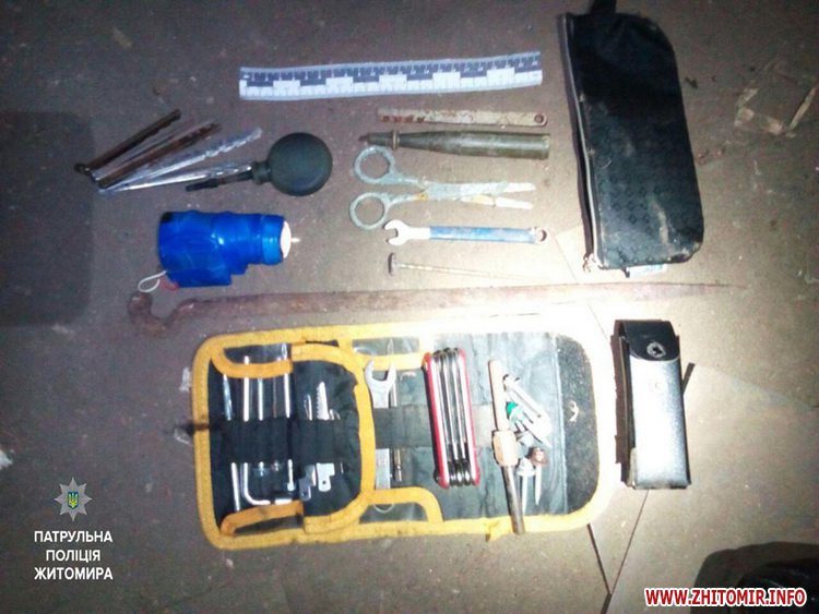 Поліцейські з’ясували, що затримані – двоє житомирян віком 33 та 38 років. Молодший вже був раніше засуджений за майнові злочини, старший - за незаконне зберігання наркотиків. Під час поверхневого огляду у них вилучили набір інструментів та пристосувань для відкривання замків, рукавички.