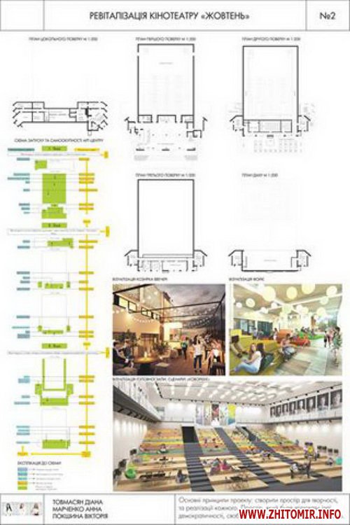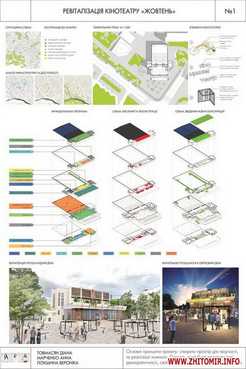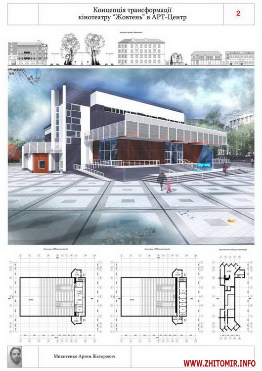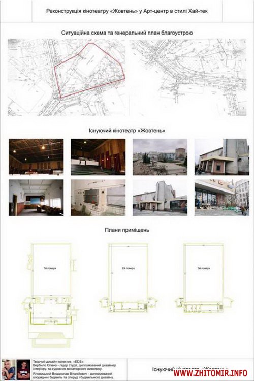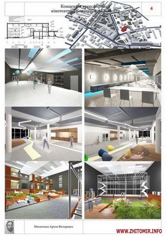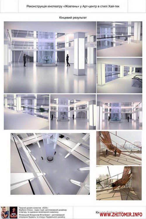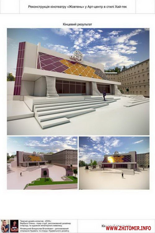 «Ідея конкурсу полягала в тому, щоб перетворити застарілу будівлю кінотеатру «Жовтень» в громадський багатофункціональний центр сучасного формату. Щоб цей об’єкт став центром культурного дозвілля житомирян, талановитих митців кіно і театрального мистецтва, художнього слова і громадських ініціатив, де можна було б проводити виставки і приймати гостей з інших міст України та світу», - прокоментував Матвій Хренов, заступник міського голови і голова журі.