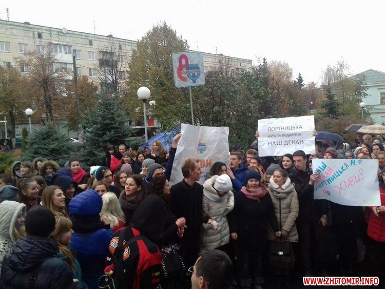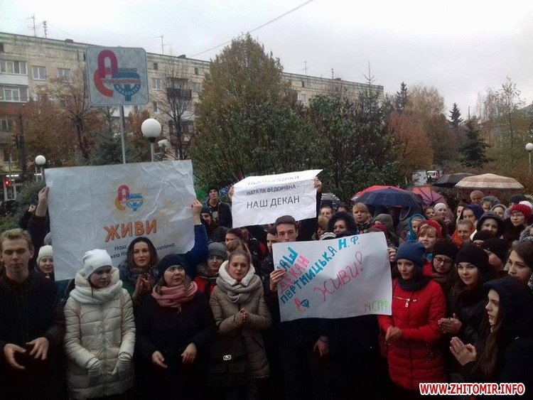 2 листопада студенти Житомирського державного університету ім. І. Франка влаштували страйк біля центрального корпусу закладу, протестуючи проти, на їхню думку, несправедливої та одноосібної кадрової політики ректора ВУЗу Петра Сауха. Зі слів студентів соціально-психологічного факультету, вони не визнають призначеного ректором нового декана.