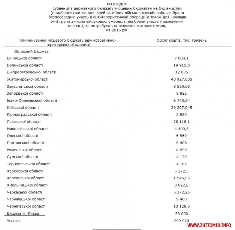 Житомирська область у 2016 році отримає 43 млн 927,035 тис.грн субвенції з державного бюджету місцевим бюджетам на будівництво (придбання) житла для сімей загиблих військовослужбовців, які брали безпосередню участь в антитерористичній операції, а також для інвалідів I-II групи з числа військовослужбовців, які брали участь у зазначеній операції, та потребують поліпшення житлових умов.