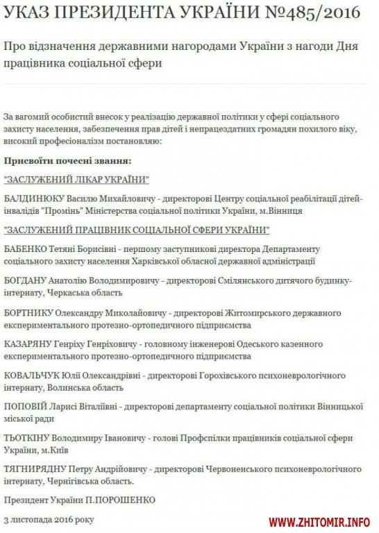 Про це йдеться в указі президента України №485/2016 «Про відзначення державними нагородами України з нагоди Дня працівника соціальної сфери», опублікованому 4 листопада 2016 року.