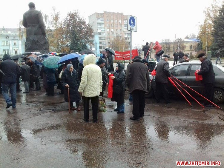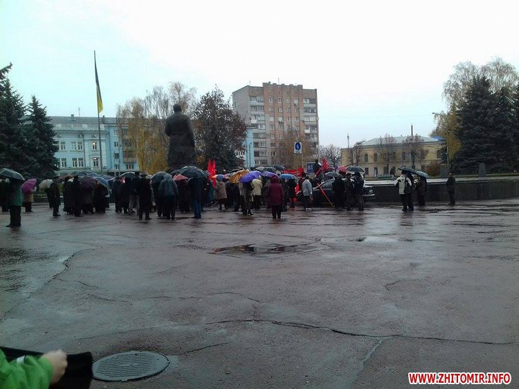 Незважаючи на дощ, у Житомиріблизько сотні людей з червоними транспарантами та парасольками провели мітинг під стінами облдержадміністрації.
