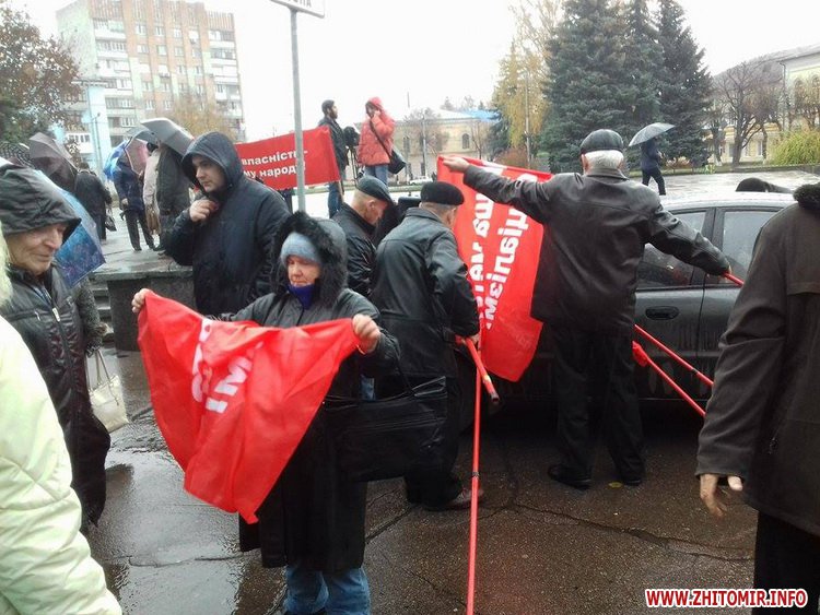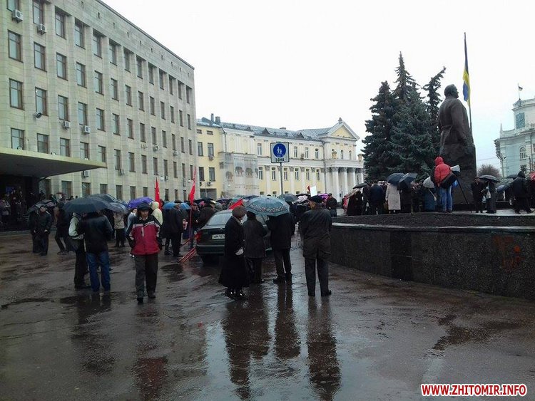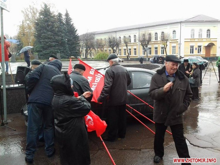 7 листопада у Житомирі на майдані Корольова зібралися прихильники забороненої Компартії. Нагадаємо, в цей день 99 років тому після залпу крейсера «Аврори» революційні солдати, робітники й матроси захопили Зимовий палац у Петрограді, скинувши Тимчасовий уряд. 7 листопада було офіційним державним святом за часів СРСР – День Великої Жовтневої Соціалістичної Революції. Скасовано після розпаду Радянського Союзу та здобуття Україною незалежності.