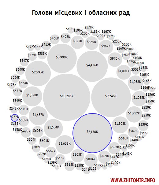 У сотні найбагатших голів місцевих і обласних рад за деклараціями 2015 року – голова Житомирської облради Анжеліка Лабунська та мер Житомира Сергій Сухомлин, причому Лабунська – у трійці «лідерів» після мера Києва Віталія Кличка та першого заступника голови Запорізької ОДА Дмитра Давтяна.