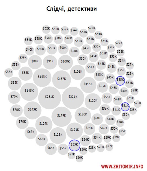 «У графіку нижче просумований капітал декларанта та його сім'ї у всіх видах валют (всі дані взяті з публічного реєстру декларацій). Для наочності в кожній групі наведені тільки перші 100 найбагатших чиновників. Ім'я та посада декларанта можна побачити при наведенні курсору. 1K = 1000», - пояснює видання.