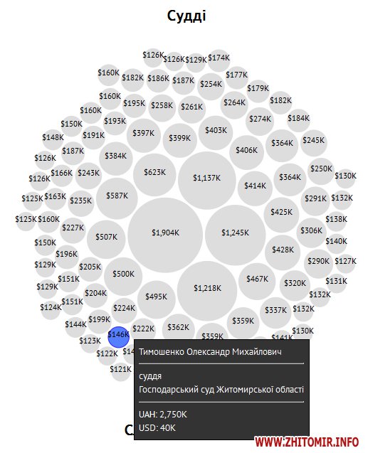 У сотні найбагатших суддів – суддя Господарського суду Житомирської області Тимошенко Олександр Михайлович. В його електронній декларації зазначено, що 1 млн 500 тис. 749 грн – гроші, присуджені за рішенням суду в 2010 році; 1 млн 248 тис. 752 грн – гроші, присуджені за рішенням суду в 2014 році; 40 тис. доларів – кошти, якими без правових підстав володіє третя особа.