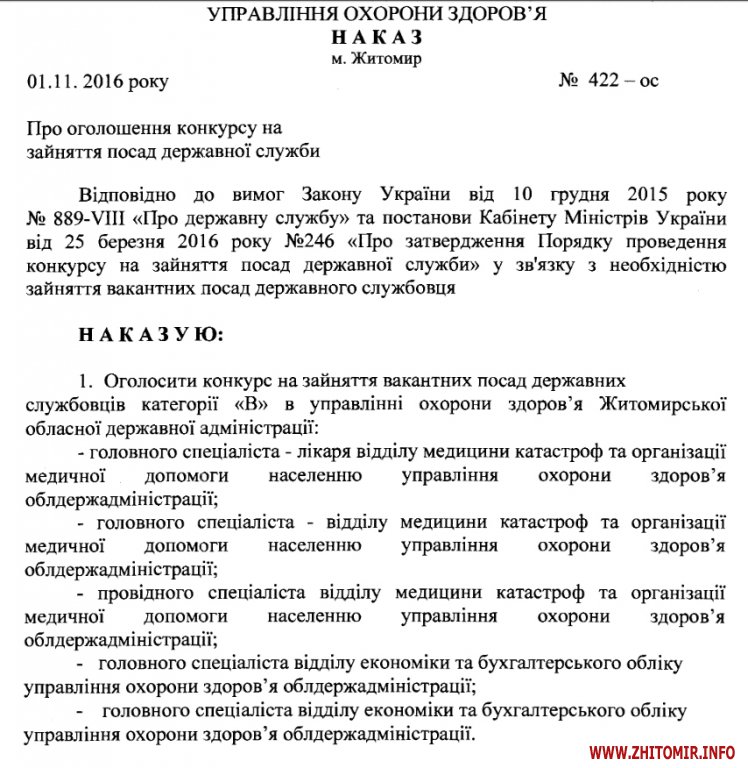 Наказ від 1 листопада 2016 року про оголошення конкурсу опублікований на сайті УОЗ.