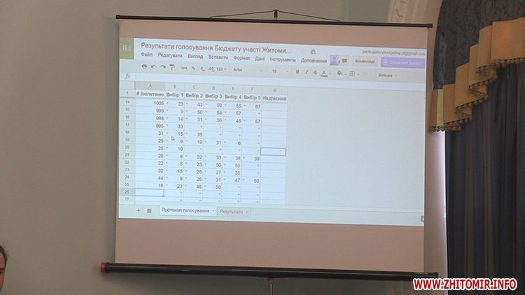 «Всього у нас брало участь 56 проектних пропозицій, за які було віддано 4223 голоси нашими житомирянами. Але деякі житомиряни були настільки активними, що вони проголосували 2 рази, тому 6 бюлетенів є недійсними. Якщо ці бюлетені будуть виявлені тут, ми будемо їх відкладати в окремий конверт», – сказала вона.