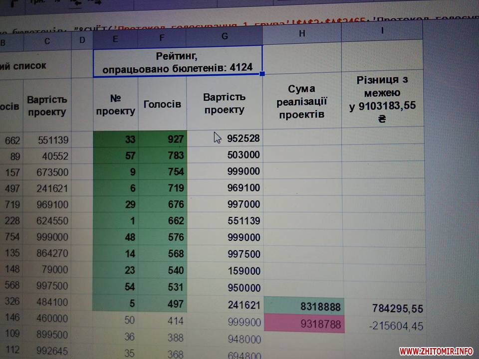 Нагадаємо, підрахунок голосів розпочався вранці 13 листопада, за 56 проектів впродовж 12 днів проголосували 4124 житомирян житомирян, попередню цифру в 4223 бюлетені у міській раді назвали некоректною через технічну посилку. З 4124 бюлетенів: 4048 – дійсні, 76 – недійсні. Недійсними вважалися бюлетені, в яких позначено більше п’яти проектних пропозицій та бюлетені осіб, які проголосували двічі.