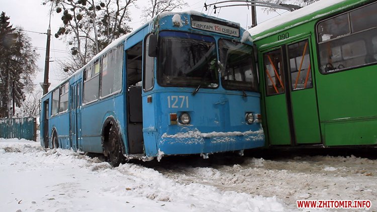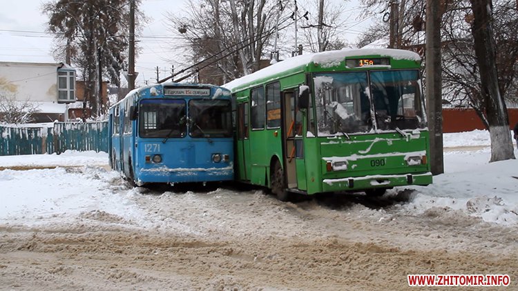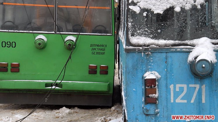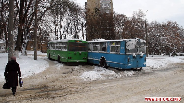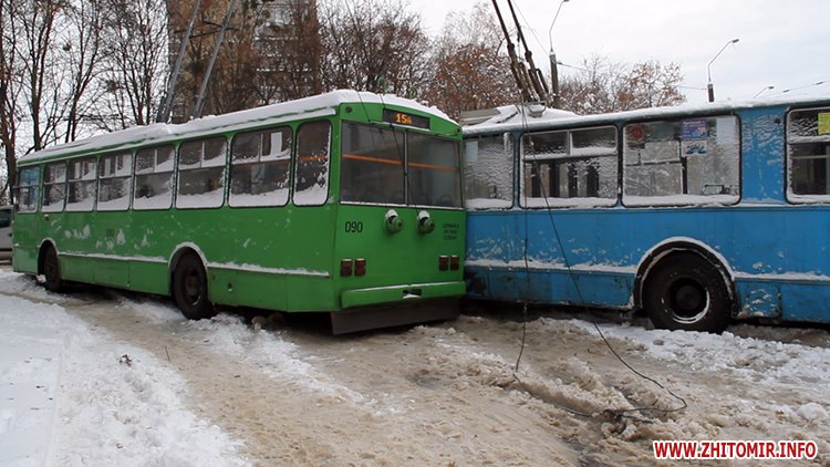 Возможно причиной стала авария на ул.Любарская, где на скользкой дороге не смогли разминуться два троллейбуса.