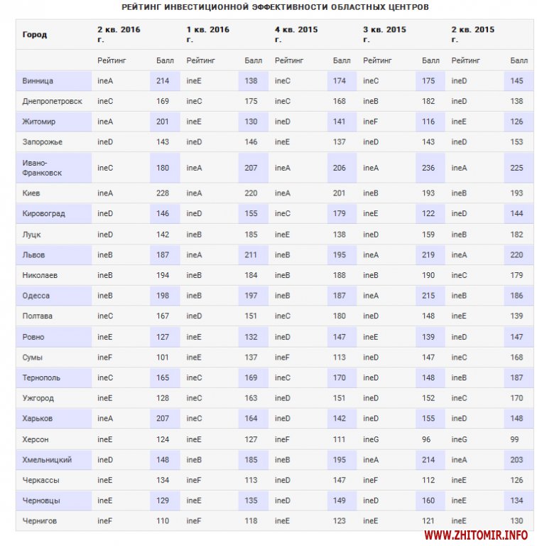 По результатам ІІ квартала 2016 года Житомир вошел в четверку лидеров в рейтинге инвестиционной эффективности по мнению экспертов агентства Евро-Рейтинг.