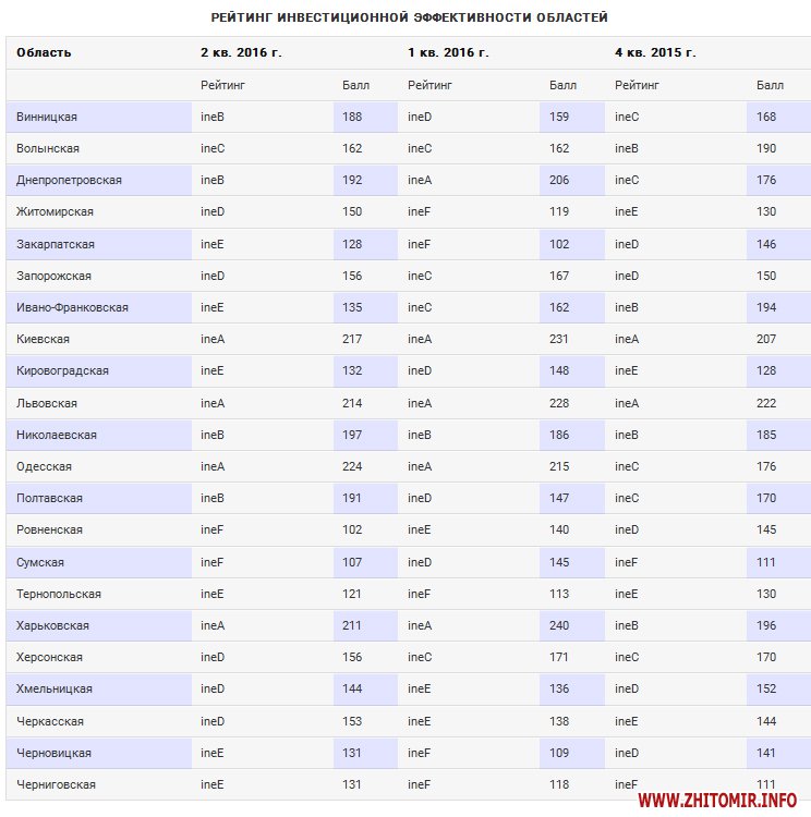 В тоже время, Житомирская область в рейтинге инвестиционной эффективности набрала 150 баллов – это средний уровень рейтинга. По итогам І квартала 2016 года область имела низкий рейтинг - 119 баллов.