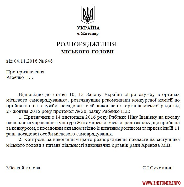 «Призначити з 14 листопада 2016 року Рябенко Ніну Іванівну на посаду начальника управління культури Житомирської міської ради як таку, що пройшла за конкурсом, з посадовим окладом згідно із штатним розписом та присвоїти їй 11 ранг посадової особи місцевого самоврядування», - йдеться у документі, опублікованому на сайті міської ради.