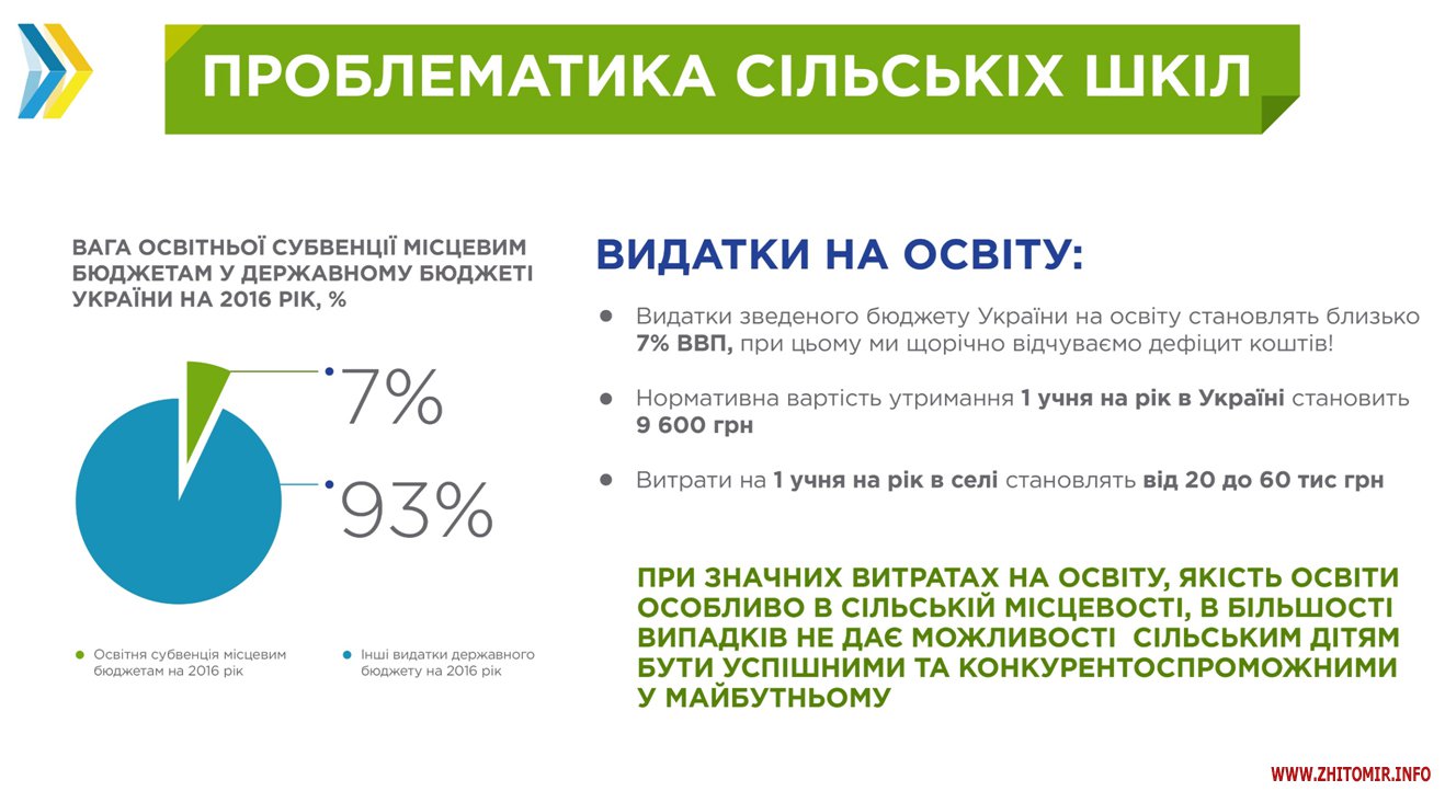 За словами Геннадія Зубка, 65% шкіл розташовані саме у сільській місцевості, у них навчаються 32% учнів і працюють 45% вчителів. Витрати на одного учня в селі становлять від 20 до 60 тисяч гривень на рік.