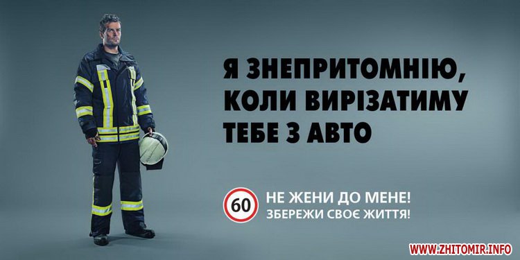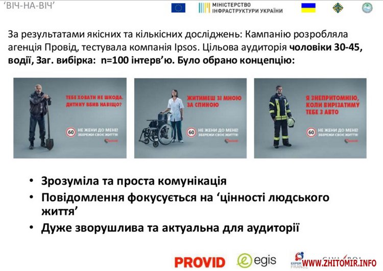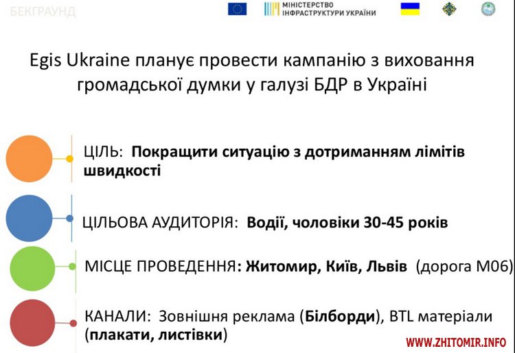 «Його презентація одночасно відбуватиметься у всіх засобах масової інформації області. А саме – в радіо- та телеефірах, на сторінках інтернет-видань, на білбордах та сітілайтах, в роздаткових матеріалах, плакатах, сувенірах тощо. Впродовж останніх двох місяців була проведена велика підготовча робота. Перш за все, були проведені кількісні та якісні дослідження (регіональні – в Житомирській області та на національному рівні). Виходячи з результатів досліджень та аналізу, був обраний основний фактор ризику – швидкість. Саме на це спрямована інформаційна кампанія. Основне гасло інформаційної кампанії: «Не жени до мене! Збережи життя!».