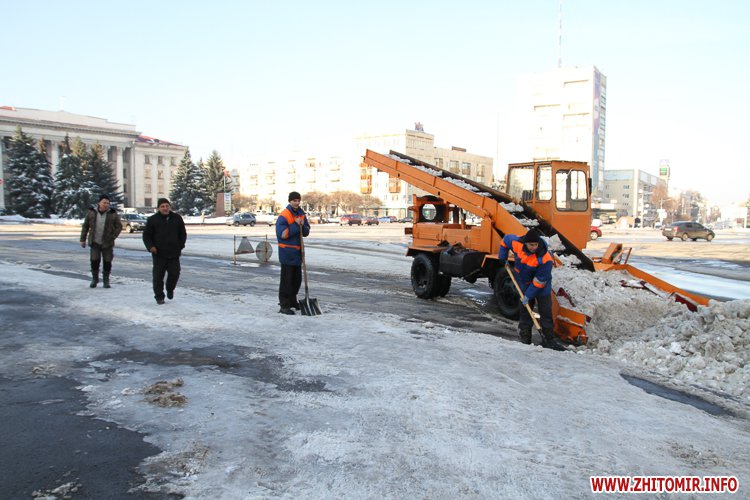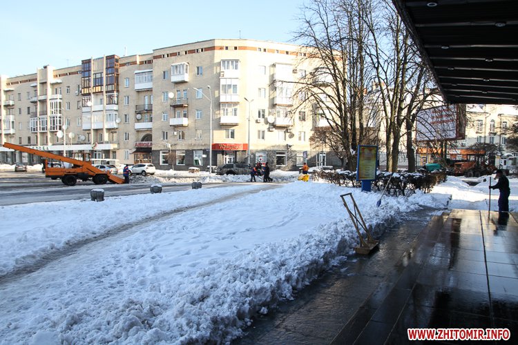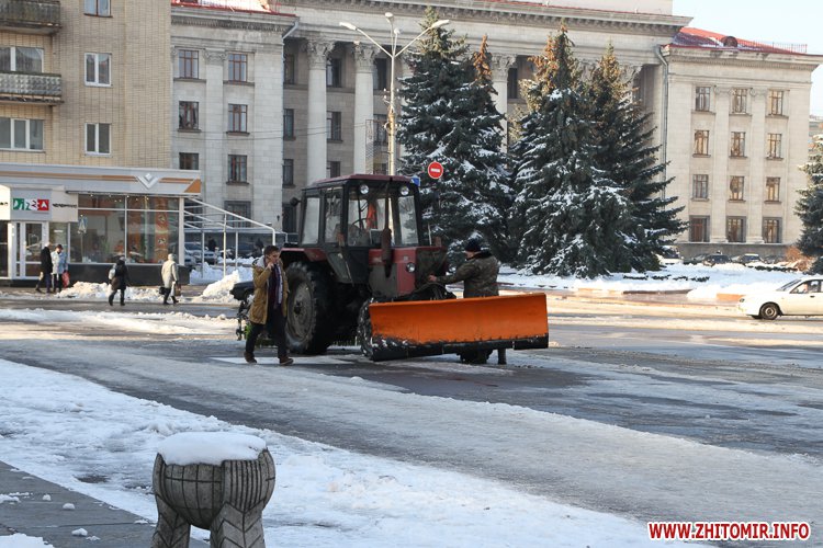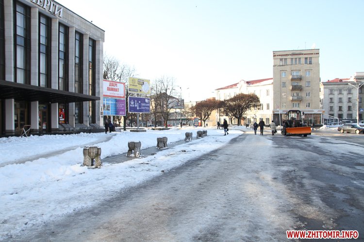 18 листопада головний майдан Житомира почали чистити від снігу, який випав вихідними. Особливо ретельно вичищають дорогу біля Житомирського драмтеатру.