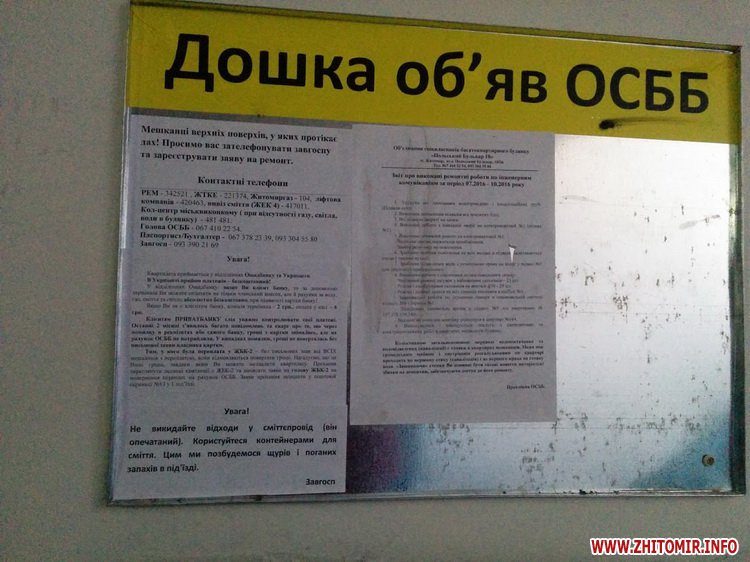 І дійсно, на інформаційних дошках у кожному під’їзді є звіти про виконану роботу, контакти аварійних служб і оголошення для мешканців верхніх поверхів, у яких протікає дах, з проханням зателефонували завгоспу і зареєструвати заяву на ремонт.
