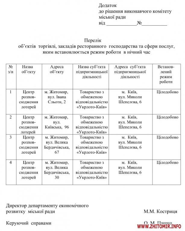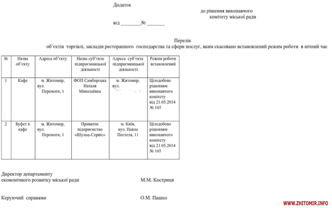 «Встановити режим роботи об’єктів торгівлі, закладів ресторанного господарства та сфери послуг в нічний час на території м. Житомира згідно з додатком. Рекомендувати суб’єктам господарювання, що зазначені в додатку, встановити камери відеоспостереження в об’єктах та на прилеглій до них території. Зобов’язати суб’єктів господарювання, вказаних в додатку: забезпечити дотримання громадського порядку в приміщеннях об’єкту та на прилеглій території; не використовувати в нічний час на прилеглій до об’єкту території звуковідтворювальну апаратуру та інші джерела побутового шуму, салюти, феєрверки та інші піротехнічні засоби; не допускати порушень санітарних норм, режиму роботи об’єкта, вимог чинного законодавства щодо порядку здійснення господарської діяльності, що зачіпають права та інтереси громадян міста при роботі в нічний час», - зазначається в проекті рішення міськвиконкому, опублікованому 21 листопада.