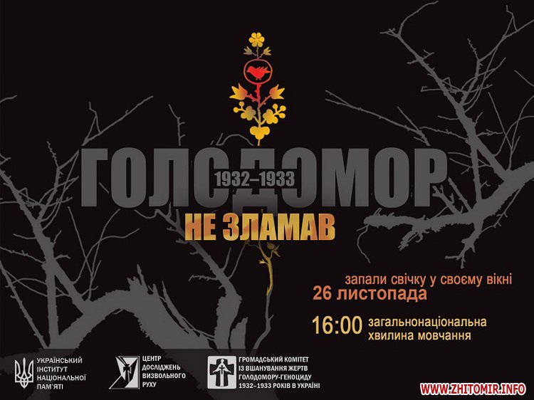 Також у суботу, 26 листопада, о 16:00 відбудеться загальнонаціональна хвилина мовчання та акція «Запали свічку пам’яті». Закликаємо усіх Жителів Житомирщини із настанням темряви запалити і поставити свічку на підвіконня так, щоб її було видно з двору – на знак скорботи і пам’яті про мільйони загублених життів наших співвітчизників. Гасло цьогорічних пам’ятних заходів: «Голодомор не зламав». Нагадаємо, у 1932-1933 роках Україна пережила страшну трагедію – Голодомор, який забрав 4,5 мільйони людських життів», - йдеться у повідомленні.