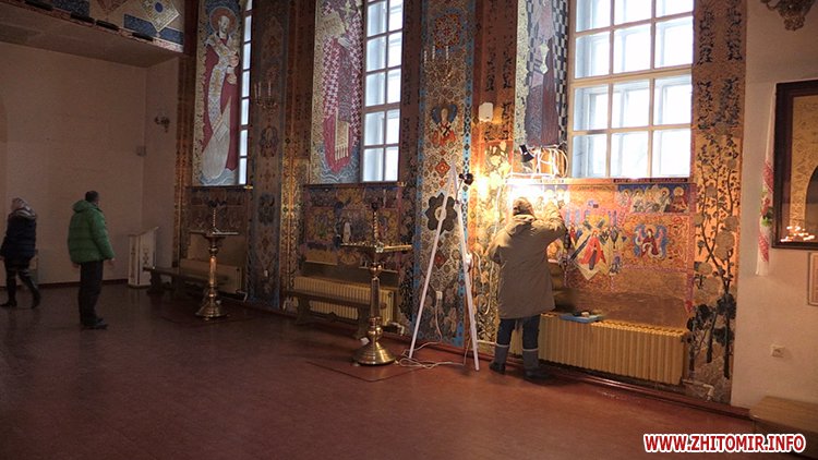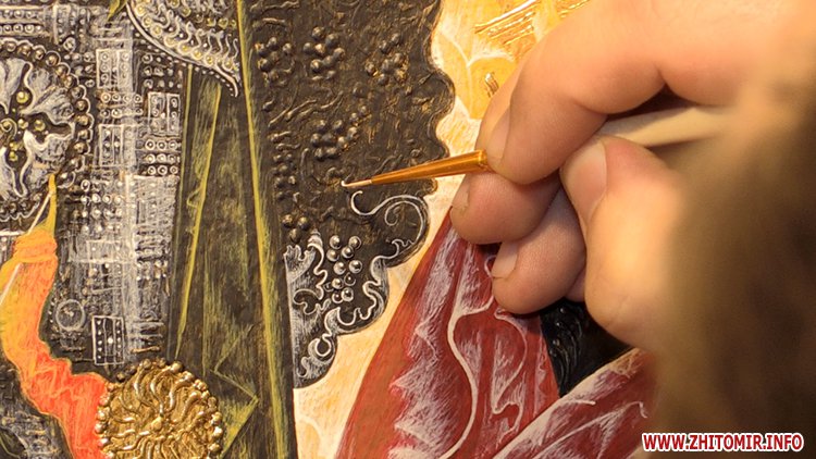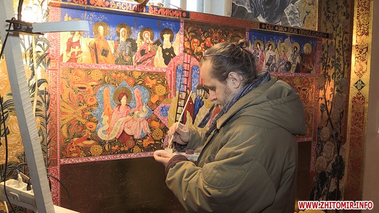 З фарбою та пензлем в руках у великому залі храму зустрічаємо Дениса. Чоловік розповідає: на його рахунку не один десяток настінних ікон, адже вже 15 років працює художником в соборі. Сьогодні, каже: вимальовує Страсний цикл.