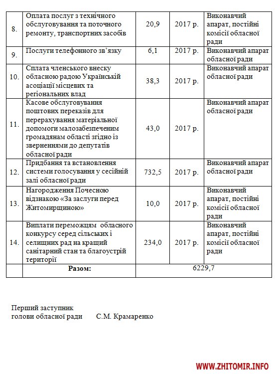 «У зв’язку з необхідністю забезпечення діяльності депутатів, постійних, тимчасових контрольних комісій, ліквідаційних комісій та депутатських фракцій обласної ради, їхньої співпраці з іншими органами місцевого самоврядування та їх об'єднаннями, забезпечення виплат, пов'язаних із проведенням щорічного конкурсуна кращий санітарний стан та благоустрій території, а також відзнаки Житомирської обласної ради «За заслуги перед Житомирщиною», враховуючи рекомендації постійної комісії обласної ради з питань бюджету і комунальної власності, обласна рада вирішила затвердити Програму забезпечення депутатської діяльності, проведення конкурсів та нагород обласної ради на 2017 рік», - зазначається у проекті рішення.