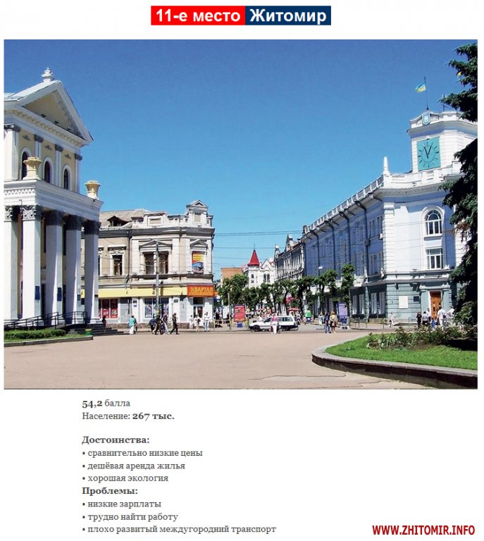 Житомир занял 11 место в рейтинг комфортности украинских городов, составленным журналом «Фокус».