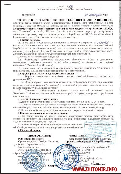 За умовами договору, ТОВ «Медіа-проспект», зареєстроване за адресою вул. В. Бердичівська, 72 у Житомирі, має виготовити «базову» та скорочену відеовізитки з двома звуковими дорожками українською та англійською мовами власною фото- та відеотехнікою з власних матеріалів про Житомирську область: її природно-ресурсний потенціал, соціальну та транспортну інфраструктуру, об’єкти промисловості та сільського господарства. Ролик також має містити високоякісні відеоефекти з використанням 3D-графіки та застосуванням об’ємної відеозйомки з висоти.