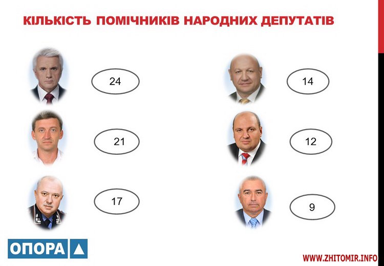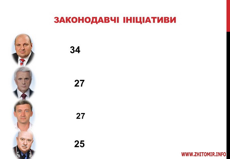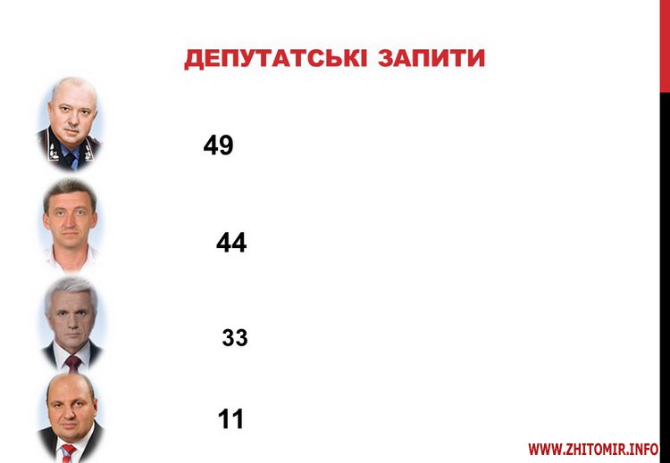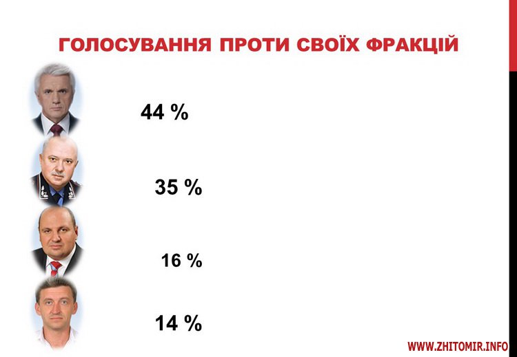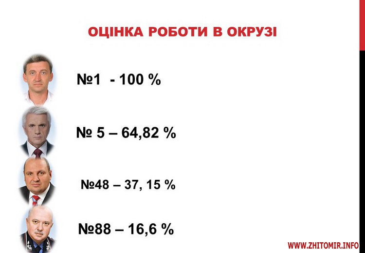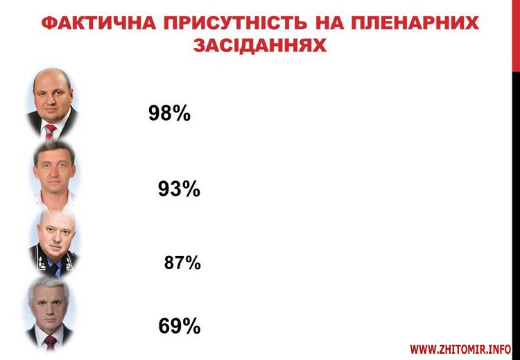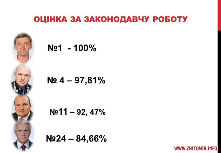 «В Житомирській області ми моніторили роботу не всіх 6 депутатів-мажоритарників, а лише 4. Перше місце у Павла Дзюблика – 100%, на 2 місці Володимир Литвин – 78,71%, на третьому місці Борислав Розенблат – 75,88%, на четвертому Віктор Развадовський – 73,45%. Як ви бачите, загальний рейтинг депутатів із Житомирської області доволі високий», - сказала Жанна Чмут.