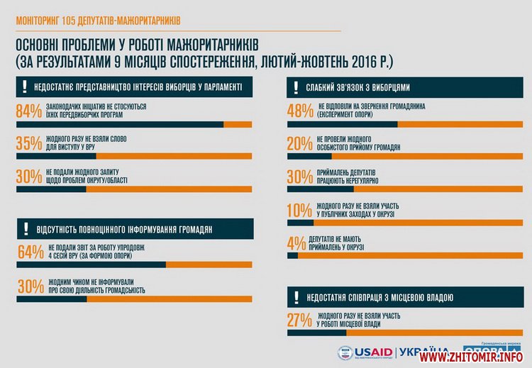 Громадянська мережа ОПОРА склала рейтинг активності нардепів-мажоритарників. Відповідний рейтинг презентували у Житомирі 28 листопада в присутності двох нардепів – Павла Дзюблика (Народний фронт) і Борислава Розенблата (БПП).