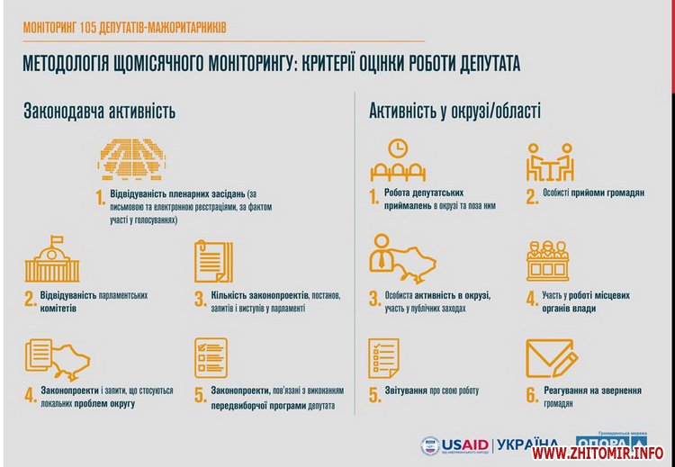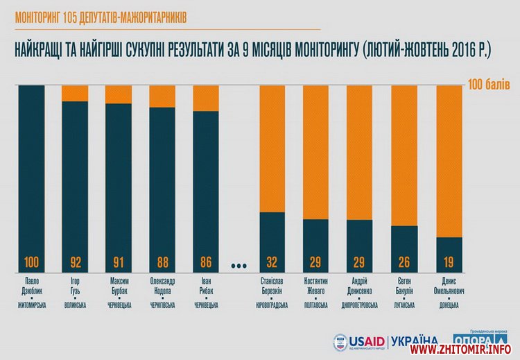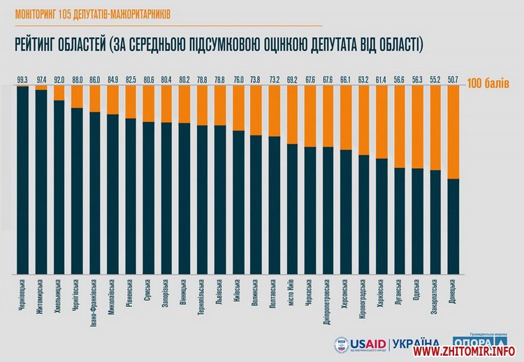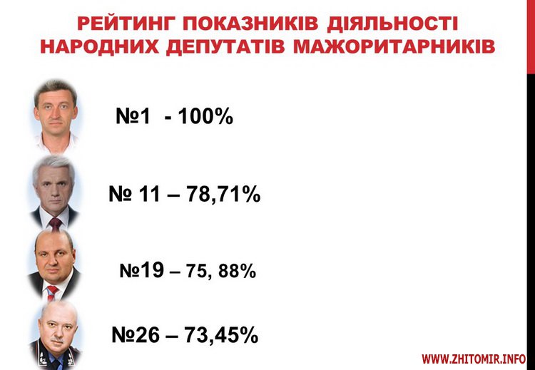 Рейтинг складався на основі оцінки роботи 105-ти депутатів-мажоритарників, серед яких 4 із 6-ти депутатів Житомирської області.