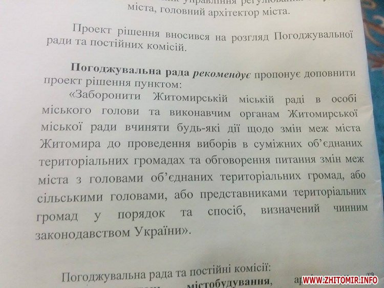 «У нас є багато запитань до Генерального плану, є багато питань до зонування, але ви на погоджувальній раді підтримали нашу пропозицію – зняти питання зонування і підтримати нашу рекомендацію та заборонити вчиняти будь-які дії щодо змін меж міста Житомира до проведення виборів в об’єднаних територіальних громадах», - оголосила Любов Цимбалюк умову, за якої фракція «Батьківщина» буде голосувати за Генплан.