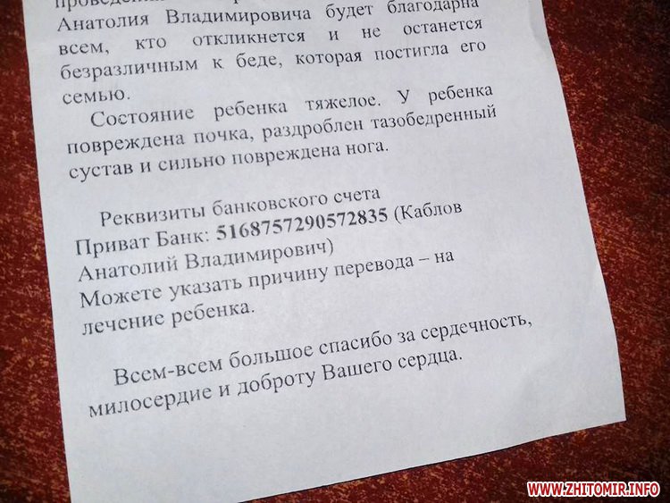 Увага! Бажаючі допомогти дев’ятирічному хлопчику можуть перерахувати певні суми коштів на рахунок його батька. Реквізити банківського рахунка в ПриватБанку: 5168 7572 9057 2835 (Каблов Анатолій Володимирович). При переказі коштів можна вказати причину: на лікування дитини.
