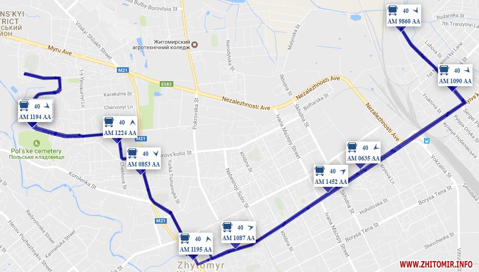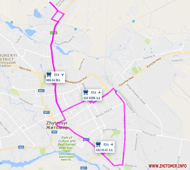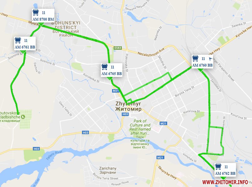 Маршрут №11 «Красовського – Паперова фабрика», перевізник: ТДВ «Житомирське АТП 11827». Зафіксовані маршрутки: 1535, 4098, 8794, 6765, 6760. Серед заявлених перевізником десяти маршруток є 1535 та 8794, в режимі реального часу відображаються лише п’ять автобусів, серед них є 6765 та 6760. Автобус з номером 4098 – «фантом».