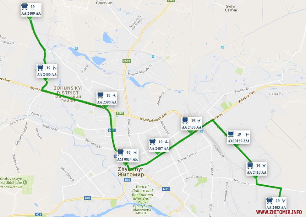 Маршрут №19 «Лісове – Біомедскло», перевізник ПП «Шеріфф». Зафіксовані маршрутки: 2405, 2406, 2305. Лише одна маршрутка (2406) є і серед заявлених і серед тих, які 13 грудня їздять по місту, 2405 в заявлених відсутня, але рухається «онлайн», 2305 знайти не вдалося. До речі, автобус маршруту №19, який травмував хлопчика ввечері 12 грудня на проспекті Миру, мав номер 4242, який відсутній в інформації про перевізника на сайті міськради.