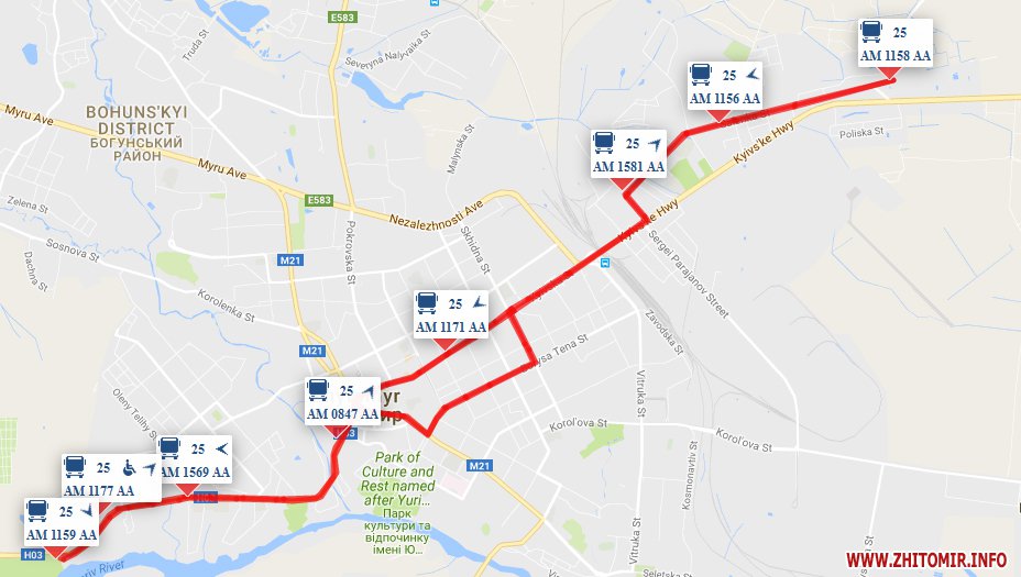 Маршрут №25 «Саєнка – Корбутівка», перевізник ПП «Іваницька Т.В.». Зафіксовані маршрутки: 1156, 1177. Обидві машини є в інформації про перевізника та на онлайн-карті.