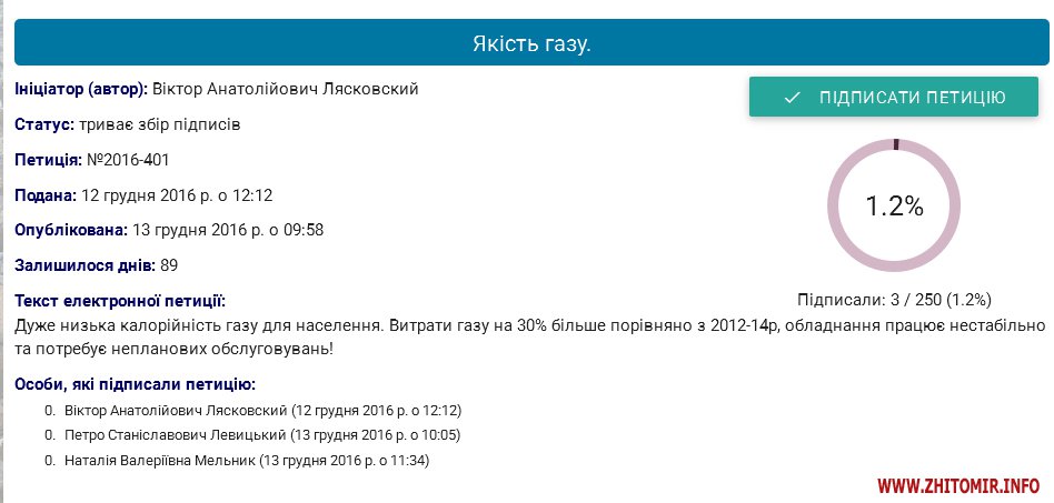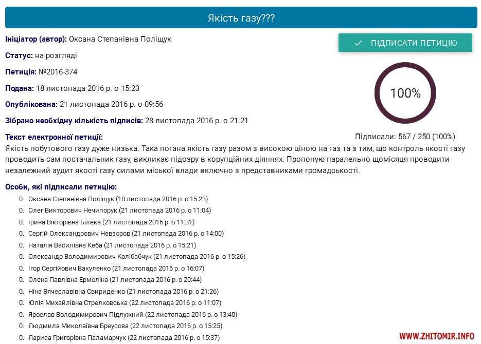 Майже за місяць, з 21 листопада по 13 грудня, на сайті Житомирської міської ради у розділі «Електронні петиції» зареєстровані п’ять звернень щодо якості газу.