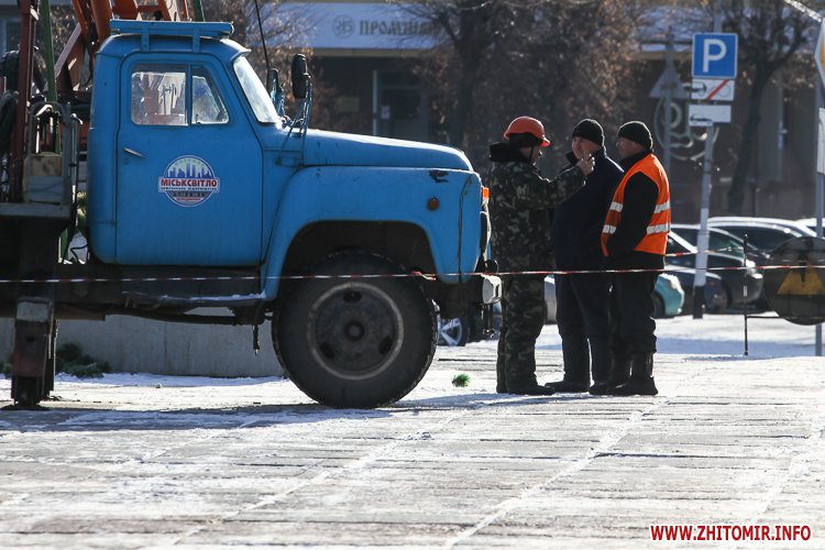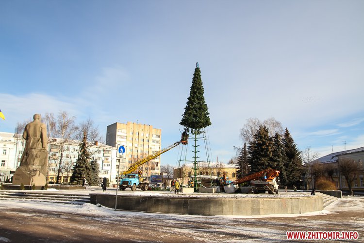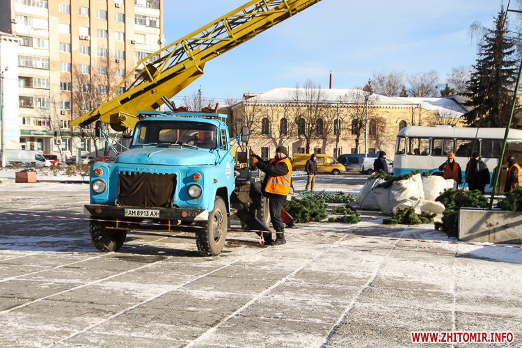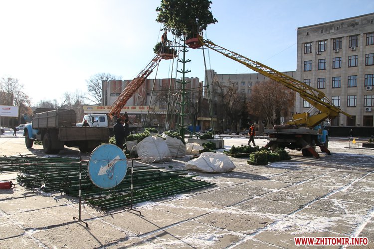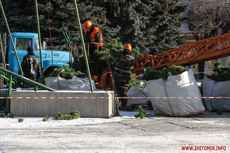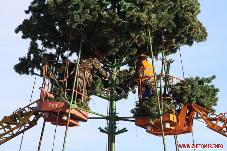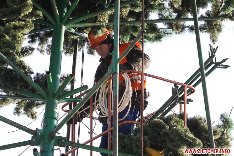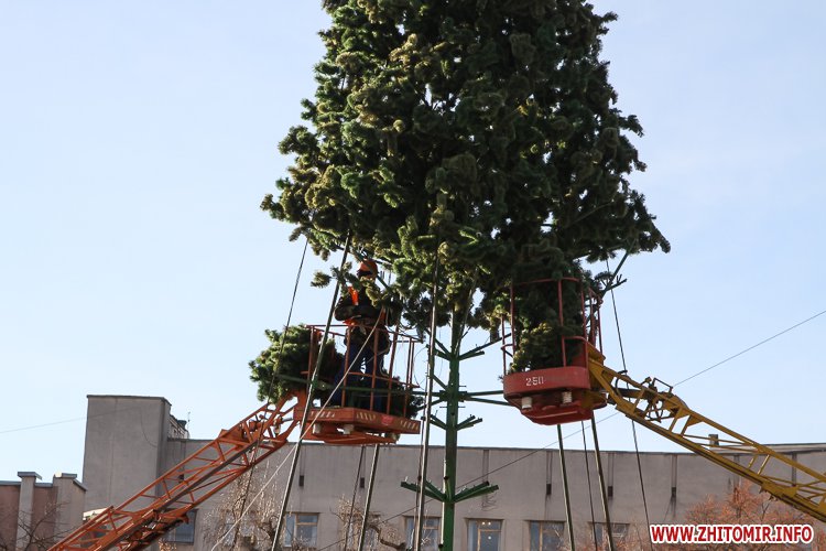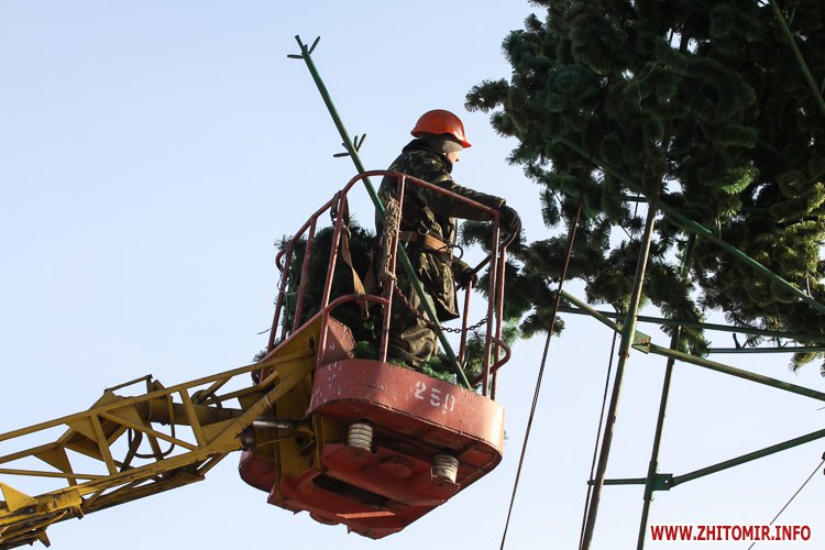 У центрі Житомира триває монтаж головної новорічної ялинки міста.
