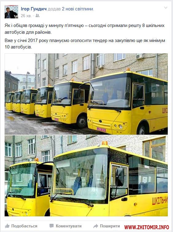 «Як і обіцяв громаді у минулу п’ятницю (16 грудня, – ред.) – сьогодні отримали решту 8 шкільних автобусів для районів. Вже у січні 2017 року плануємо оголосити тендер на закупівлю ще як мінімум 10 автобусів», – написав губернатор.