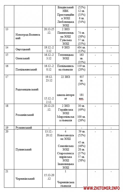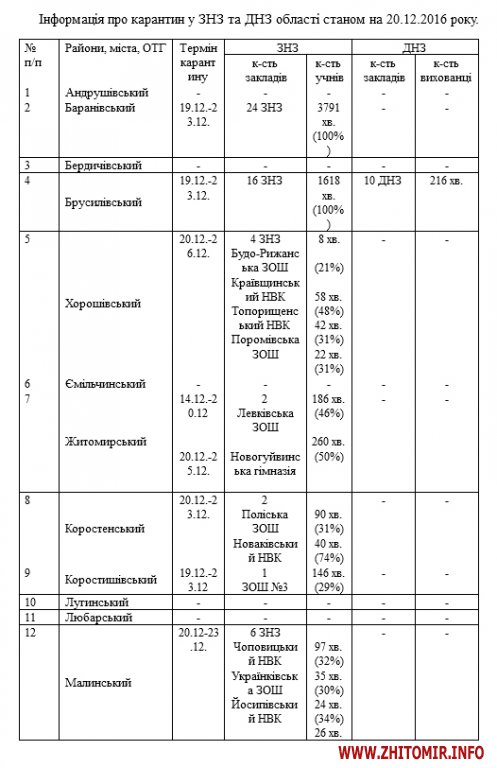 «За інформацією управління освіти та науки, у зв’язку зі збільшенням кількості учнів, хворих на грип та ГРВІ, навчально-виховний процес призупинено у Баранівському, Брусилівському, Хорошівському, Житомирському, Коростенському, Коростишівському, Малинському, Новоград-Волинському, Овруцькому, Олевському, Попільнянському, Радомишльському, Романівському, Ружинському, Пулинському, Черняхівському та Чуднівському районах, а також у містах Житомир, Новоград-Волинський, Малин та у Високівській, Дубрівській, Народицькій ОТГ», - йдеться у повідомленні.