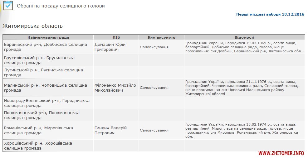 Головою Довбиська селищна громада Баранівського району обраний Юрій Домашенко, Чоповицької селищної громади Малинського району – Михайло Філоненко, Миропільської селищної громади Романівського району – Валерій Гиндич. Всі три кандидати – самовисуванці.