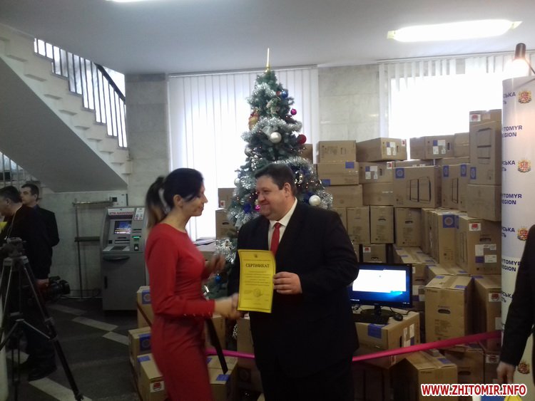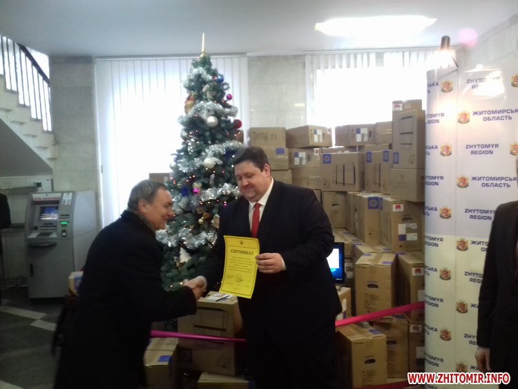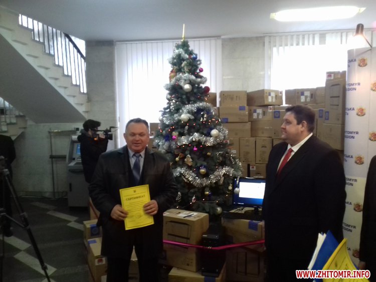 У рамках соціального проекту, втіленого завдяки домовленостям між урядами України та Китайської Народної Республіки, до Житомирщини надійшли 834 комплекти комп’ютерів, які передадуть до шкіл області. Усі пристрої оснащені ліцензійним програмним забезпеченням. Сертифікати на їх отримання голова Житомирської ОДА Ігор Гундич і голова облради Володимир Ширма вручили керівникам міст, районів і ОТГ 21 грудня.