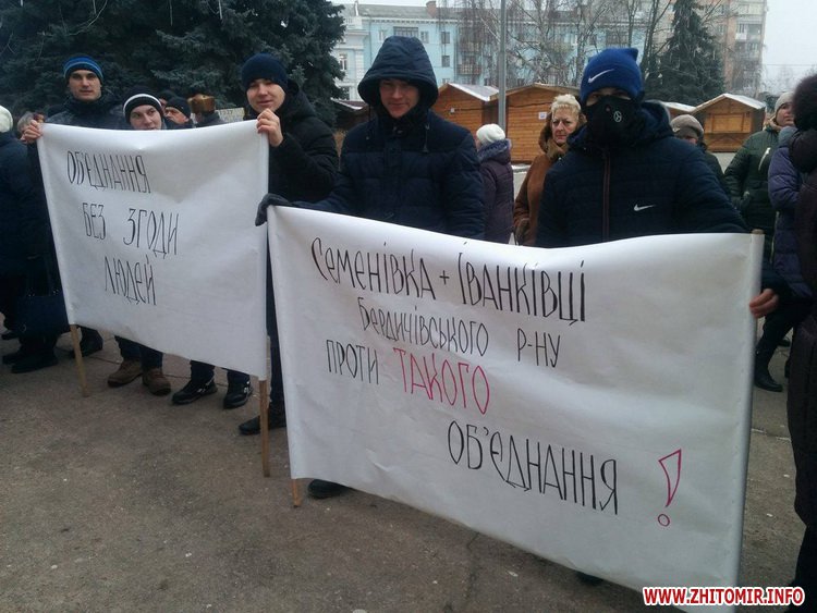 Люди тримають плакати «Ні шкідливому підприємству», «Не забирайте в людей чисте повітря», «Захистіть наше конституційне право на чисте повітря», а також «Семенівка+Іванківці Бердичівського району проти такого об’єднання!», «Об’єднання без згоди людей», «Місцева влада проти людей».